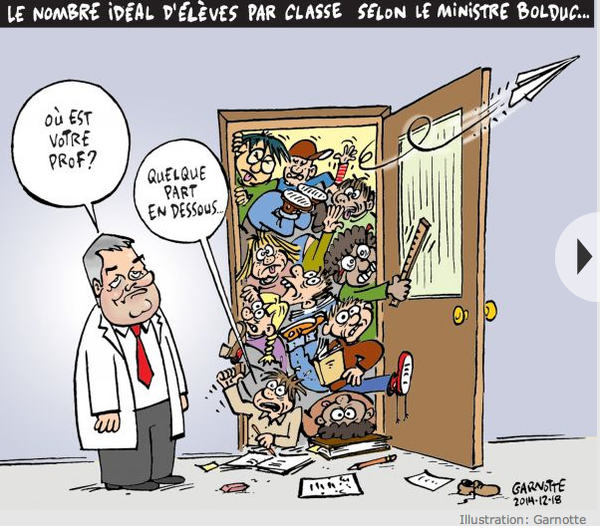 Conséquemment, nous apprenions ce matin via la Presse qu’il fallait s’attendre à une hausse du ratio maitre-élèves dans les classes. Selon la Presse, les mesures que s’apprête à mettre sur la table notre gouvernement libéral prévoient une augmentation du nombre d’élèves, un gèle salarial de deux ans et une coupe dans les congés de maladie des employés de la fonction publique.